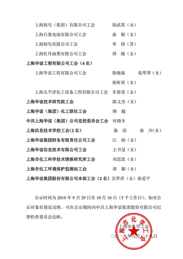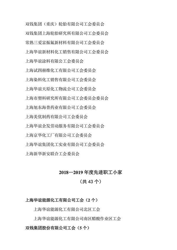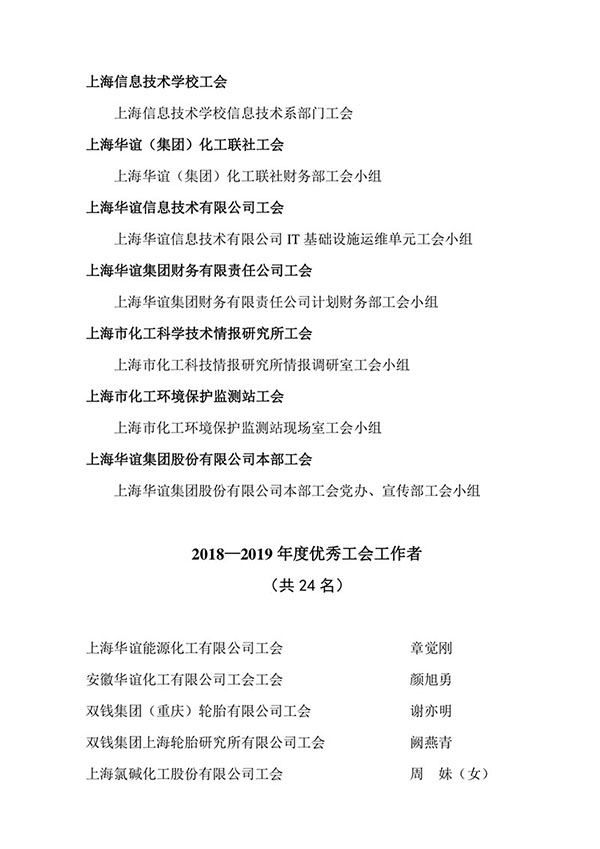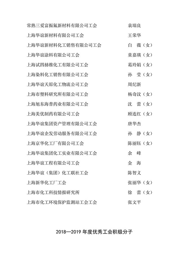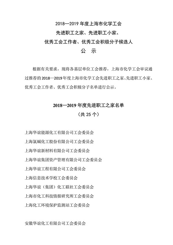 2018—2019年(nián)度上(shàng)海市(shì)化學工(gōng)會(huì)先進職工(gōng)之家、先進職工(gōng)小(xiǎo)家、 優秀工(gōng)會(huì)工(gōng)作者、優秀工(gōng)會(huì)積極分子候選人公示